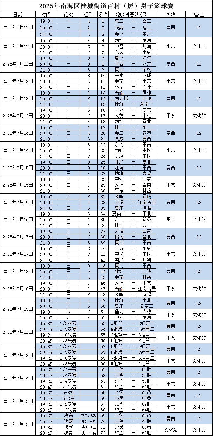 (二)比赛分两阶段进行:第一阶段按报名队数分若干组进行循环比赛,第二阶段采用淘汰及附加赛决出名次;冠军、亚军队将代表桂城街道参加2025年南海区百村(居)男子篮球赛。