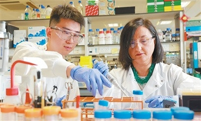 沃尔波尼(右)和同事正在进行实验。 本报记者 许立群摄